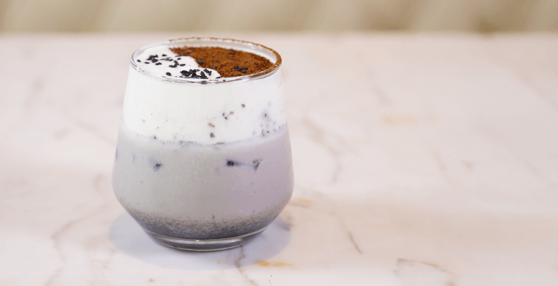 Experience the Moonstone Latte, a refined mix of black sesame, oat milk, and tiramisu syrup that brings a softly comforting note to every sip.